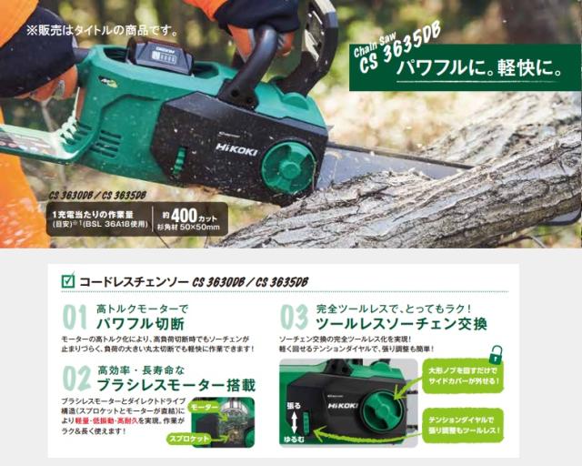 HiKOKI コードレスチェンソー CS3635DB(XPZ) バッテリ(BSL36A18X)+急速充電器(UC18YDL2)付 ガイドバー長さ350mm 36V対応 ハイコーキ 日立
