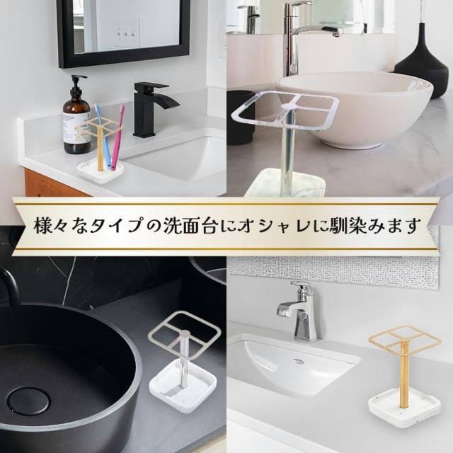 【オシャレな歯ブラシスタンド】トレー部分は樹脂素材を使用し大理石特有の模様やザラリとした石のような手触りを再現。ラック部分のゴールド/シルバーの光沢感と大理石調のトレーの組み合わせで、シンプルながらも高級感を感じられるデザインになっています。様々なタイプのお部屋・洗面台に馴染む万能的なデザインです。トレー部分にある程度の重みがあるので倒れることなくご使用いただけます。※大理石調のマーブル模様は個体差があります。