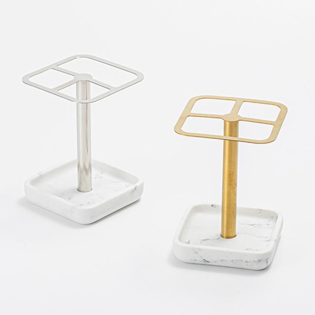 【オシャレな歯ブラシスタンド】トレー部分は樹脂素材を使用し大理石特有の模様やザラリとした石のような手触りを再現。ラック部分のゴールド/シルバーの光沢感と大理石調のトレーの組み合わせで、シンプルながらも高級感を感じられるデザインになっています。様々なタイプのお部屋・洗面台に馴染む万能的なデザインです。トレー部分にある程度の重みがあるので倒れることなくご使用いただけます。※大理石調のマーブル模様は個体差があります。