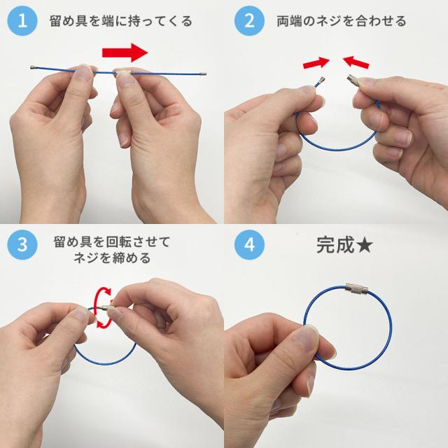 【色ランダム10本SET】全6色(黒、シルバー、マスタード、紫、青、緑)のうち1SET=ランダムで10本お届けします。何色があるかは届いてからのお楽しみです♪※完全ランダムのため、色被りや偏りなどはご容赦ください。【使い方いろいろ】★ワイヤーにビーズやチャームなどのパーツを通してオリジナルキーホルダーに★鍵をぶら下げてキーリングに★大切なキーホルダーを落とさないための補強用に様々な場面で活躍する便利なアイテムです。※穴の直径が4mm以上のパーツをワイヤーに通すことができます。