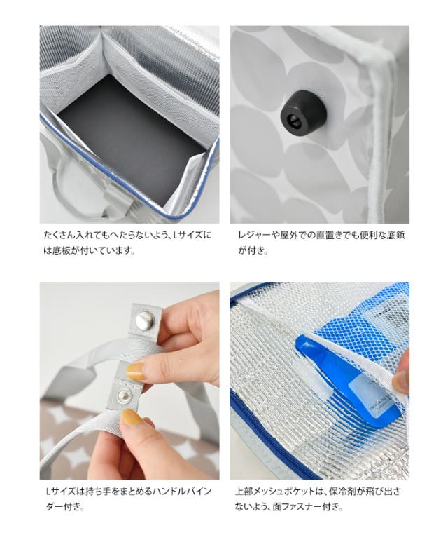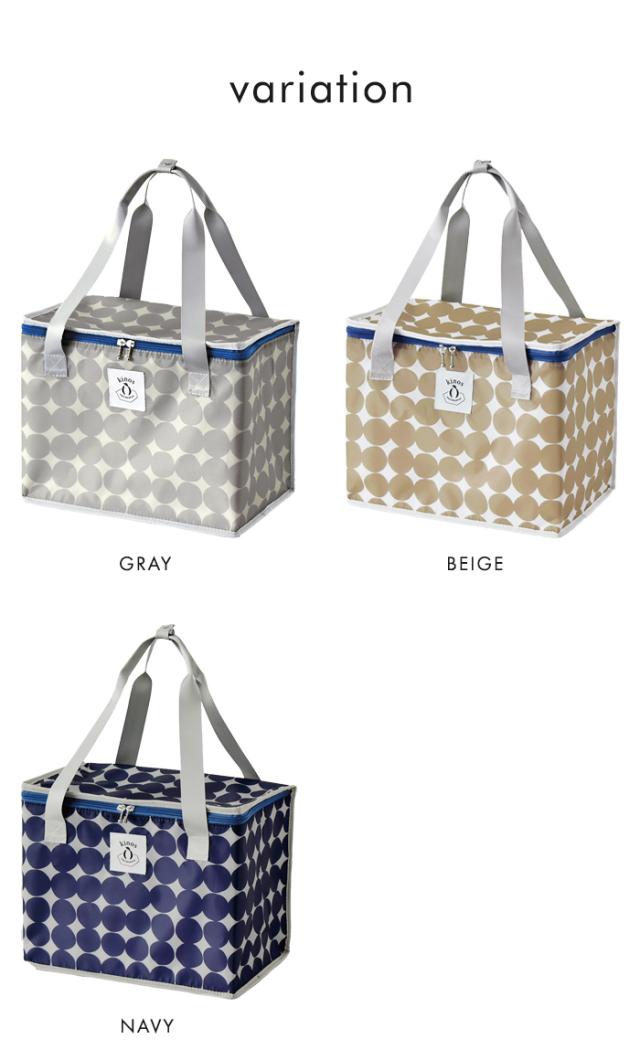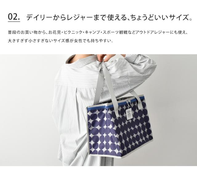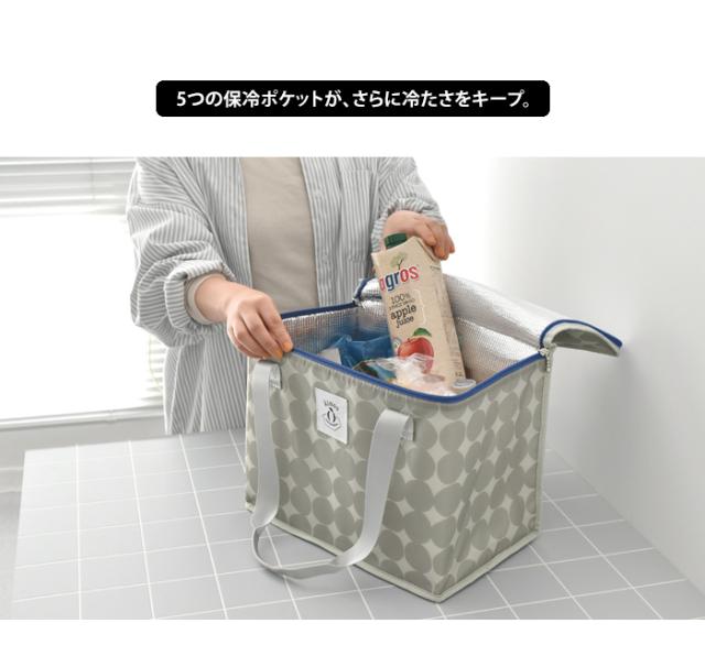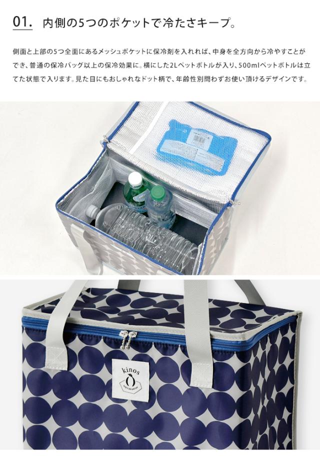 側面と上部の5つ全面にあるメッシュポケットに保冷剤を入れれば、中身を全方向から冷やすことができ、普通の保冷バッグ以上の保冷効果に。横にした2Lペットボトルが入り、500mlペットボトルは立てた状態で入ります。見た目にもおしゃれなドット柄で、年齢性別問わずお使い頂けるデザインです。普段のお買い物から、お花見・ピクニック・キャンプ・スポーツ観戦などアウトドアレジャーにも使え、大きすぎず小さすぎないサイズ感が女性でも持ちやすい。レジャー帰りやシーズンオフなどの使わない時は、折りたたんでコンパクトに。車に常備しておいても邪魔になりません。