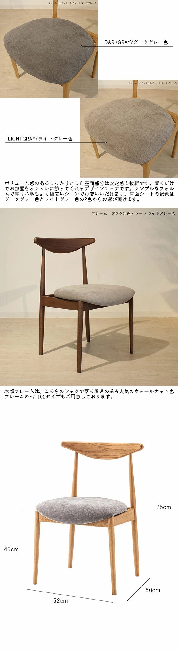 FOR7-101ダイニングチェアー【1脚単品】木部:ナチュラル色・座面ライトグレー色 / 全2×2色 横幅52 奥行50 高さ75 (座面高さ45) cm アッシュ材 天然木 無垢 北欧スタイル シンプル 軽量チェア