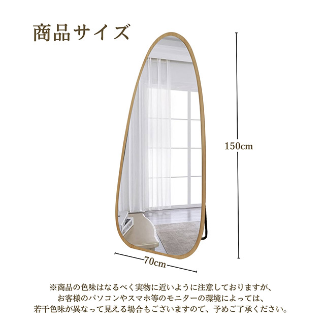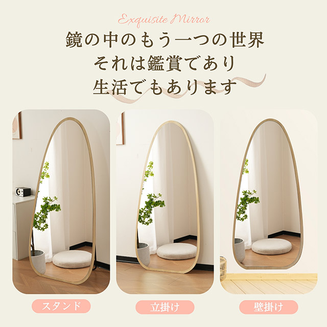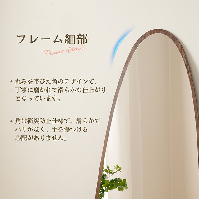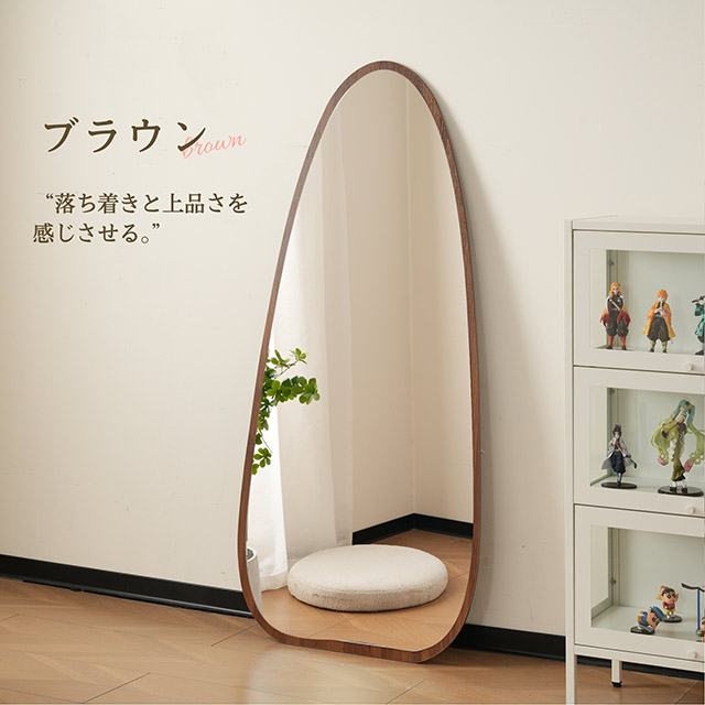 【水滴型のフレーム】水滴型のフレームを仕上げ、安全性やインテリア性も抜群です。リビング、寝室、和室、洋室、店舗用などどこでもお使い頂けるおしゃれな全身ミラーです。