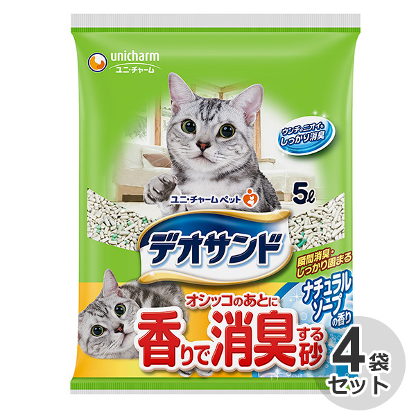 ケース / 国産 デオサンド オシッコのあとに香る砂 ナチュラルソープ 5L × 4袋 猫砂 ネコ砂 鉱物系 ベントナイト 消臭 瞬間消臭 しっかり固まる せっけんの香り オシッコのあとに香りで消臭する砂 日本製 トイレ サンド 固まる ユニ・チャーム ユニチャーム