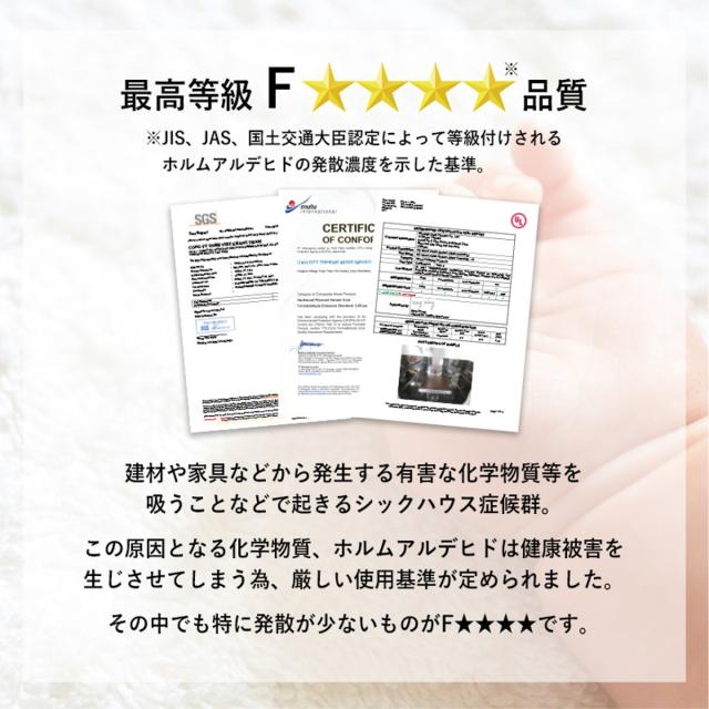 すべてのお客さまに安心して使っていただけるよう、低ホルマリンを証明する「F☆☆☆☆」の部材、塗料を使用しています。