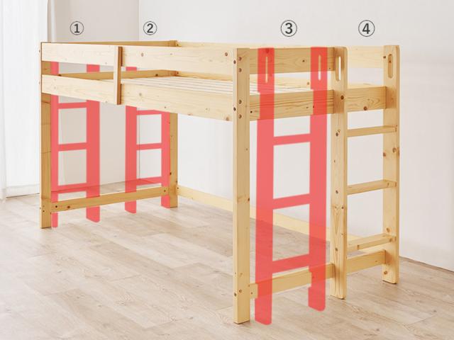 ハシゴは4か所に付け替えが可能です。ドアや家具の邪魔にならないよう配置ができるので、小さなお部屋でも安心です。