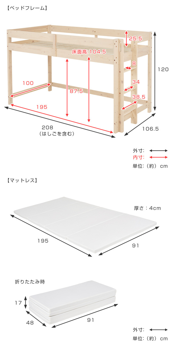 | サイズ | 【ベッド】 幅106.5×奥行208×高さ120(cm) 【マットレス】 幅91×奥行195×高さ4(cm) |