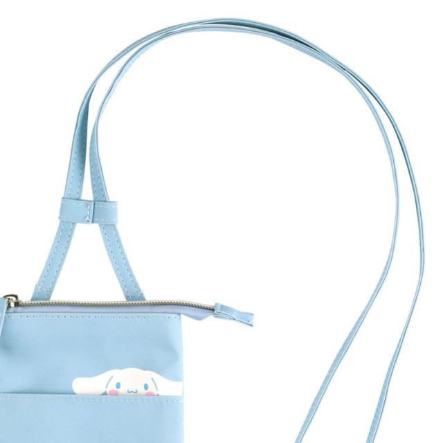 前ポケットからひょっこり顔を出す姿が愛らしい、シナモロールのスマホポーチです。上部にチャックがついているので、小銭や小物入れとしても重宝します。
