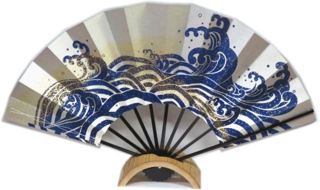 舞扇子≪花2866 銀地 波 紺 金箔≫9寸5分 黒塗竹 化粧箱入り 京扇子 扇子 舞扇 紅葉
