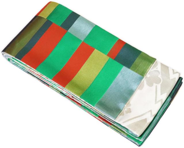 わけあり 四寸帯 金襴帯026 緑朱銀 白地銀松葉菱花菱 両面違い 日本製 半巾帯 4寸帯 リバーシブル
