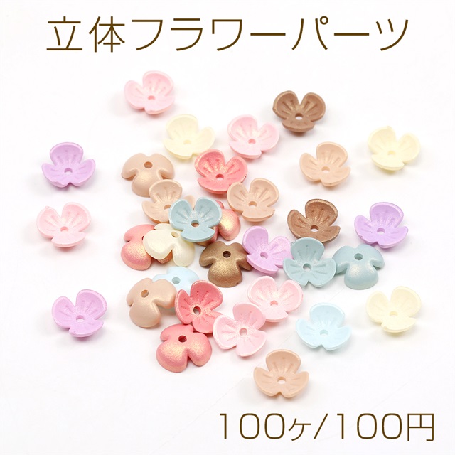 立体フラワーパーツ アクリルビーズキャップ フラワーチャーム 花座 小花パーツ 三弁花 中心穴あり ミックスカラー 9mm(100ヶ)