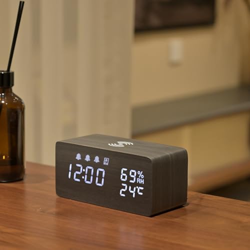 Electime 目覚まし時計 置き時計 スマホ充電機能 デジタル 多機能 木目 卓上時計 Qiワイヤレス充電器 スヌーズ 温度/湿度/アラーム 自動