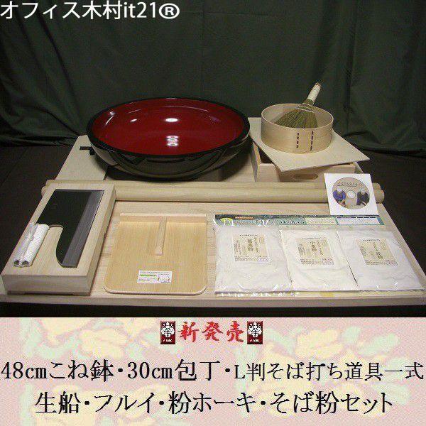 48センチこね鉢・30センチ包丁・L判そば打ち道具一式・生船・フルイ・粉ホーキ・そば粉セット(極上石臼一本挽き)(そば打ちセット) オフィス木村it21
