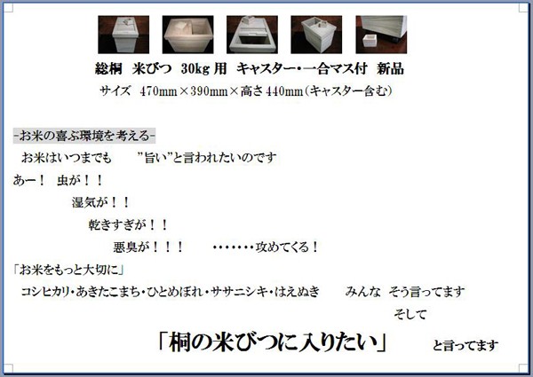 総桐の米びつ 30キロ用:47×39×高さ44センチ、キャスター付き、一合升付属
