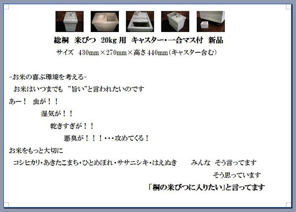 総桐の米びつ 20キロ用:43×27×高さ44センチ、キャスター付き、一合升付属