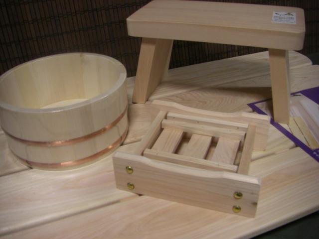 《商品説明》 ◎すのこ:ヒノキ・Mサイズ 48×85×h4.2センチ ◎風呂いす:アラスカヒノキ ◎湯桶:えぞ松 ◎石鹸台:ヒノキ ※森林にいる様な木の香パラダイス