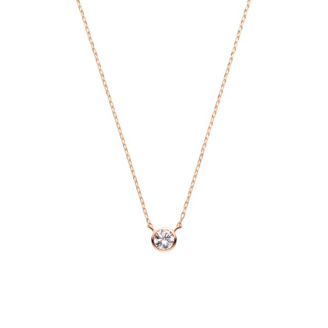 ピンクゴールドのラインでなめらかに縁取られた一粒ダイヤモンドネックレス。