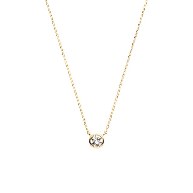 イエローゴールドのラインでなめらかに縁取られた一粒ダイヤモンドネックレス。
