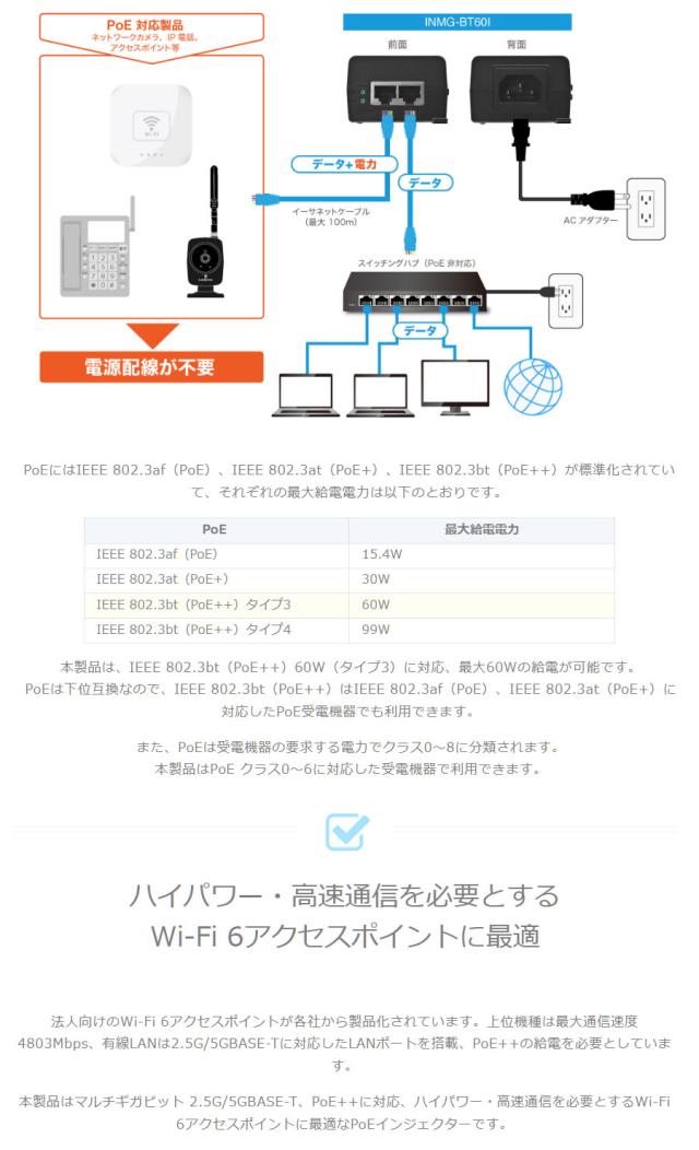 | マルチギガビット対応 PoE++インジェクター 60W給電 INMG-BT60I スペック情報 | |