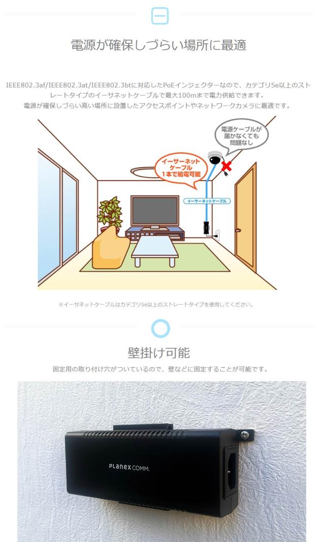 5Gbps/2.5Gbpsの高速通信が可能、最新のPoE++(IEEE 802.3bt)規格に対応していますので、近年普及が進むハイパワー・高速通信を必要とするWi-Fi 6アクセスポイントの設置に最適です。