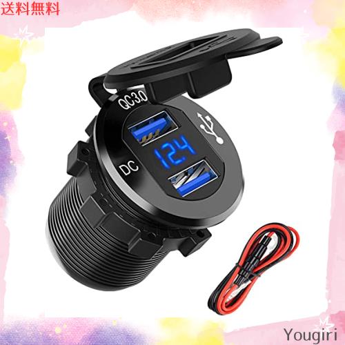 バイク用 チャージャー USB充電器 防水 QC 3.0 カーパワーソケット デュアル 2 ポート 36W 急速充電LED電圧計 12V / 24V 車/バイク/オー