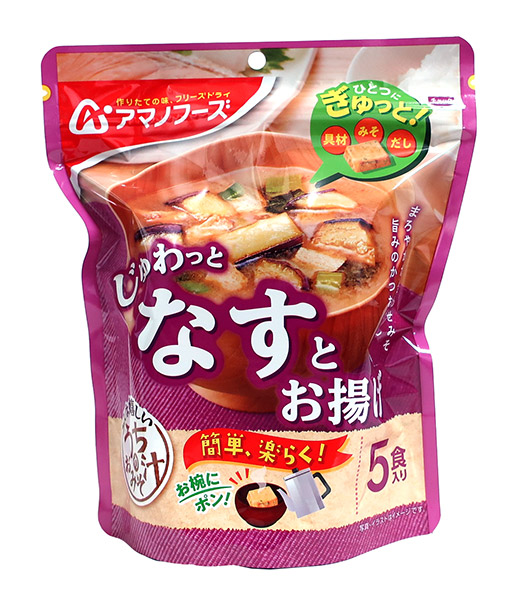 米みそ(国内製造)、揚げなす、ねぎ、調合みそ、風味調味料、油揚げ、乾燥わかめ、かつお節粉末、でん粉、食塩、酵母エキスパウダー/調味料(アミノ酸等)、加工デンプン、凝固剤、酸化防止剤(ビタミンE)、酸味料、(一部にさば・大豆・魚醤(魚介類)を含む)