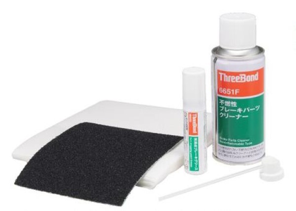 キット内容:不燃性ブレーキクリーナー(180g)×1本、無滴点シリコーングリース(15ml)×1本(エアゾール)、サンドペーパー(#40)×1枚、ペーパーウエス×4枚、部品交換袋×1枚