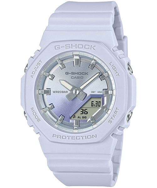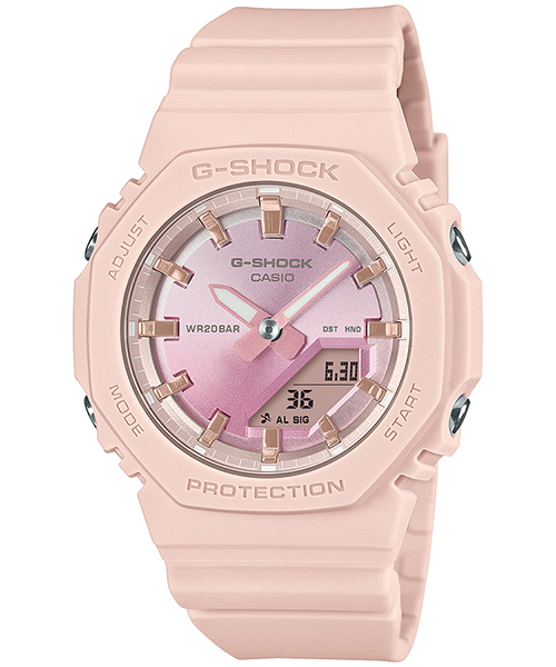 ベースモデルは、人気のデジタル・アナログコンビモデルGMA-S2100を更に小型化したGMA-P2100。バンドの長さも短くすることで、手首の細い方にもフィットするよう装着性を高めました。美錠とサイドボタンもステンレス素材を使用し、質感を高めています。シンプルでミニマルな印象になるように仕上げました。ベゼル、バンドの主な樹脂パーツにバイオマスプラスチックを採用。原料に再生可能な有機資源を使うことで、環境負荷低減への貢献が期待されています。