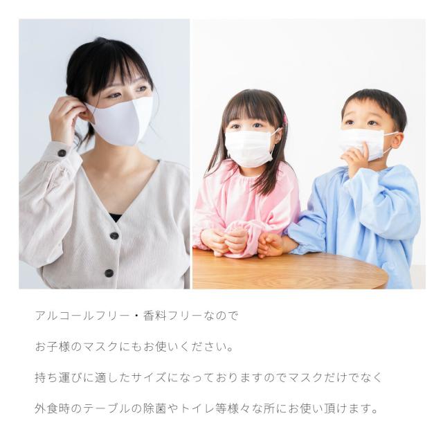 | 使用上の注意 | ●本来の用途以外には使用しないでください。 ●お子様の手の届かに所に保管してください。 ●使用後、肌に違和感がある場合はご使用をお控えください。 ●皮革、合皮、エナメル、絹、和装品には使用しないでください。 ●必ずご使用前にシミや色落ちが発生しないか目立たない部分で確認してください。 ●色落ちしやすいもの等には使用しないでください。 ●アルミ製品には使用しないでください。変質させる恐れがあります。 ●蓋をあけたまま保管しないでください。 ●目に入った場合や誤飲してしまった場合はすぐに流水等で対処し、医師にご相談ください。 ●すべての菌を除菌できるわけではありません。 |