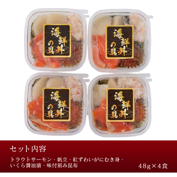 48g(トラウトサーモン・帆立・紅ずわいがにむき身・いくら醤油漬・味付刻み昆布) ×4食セット