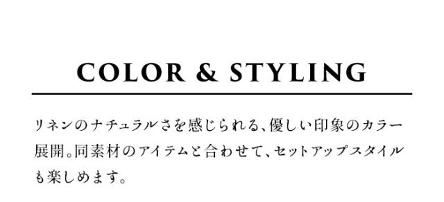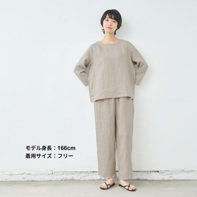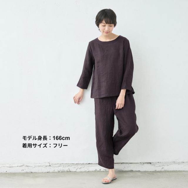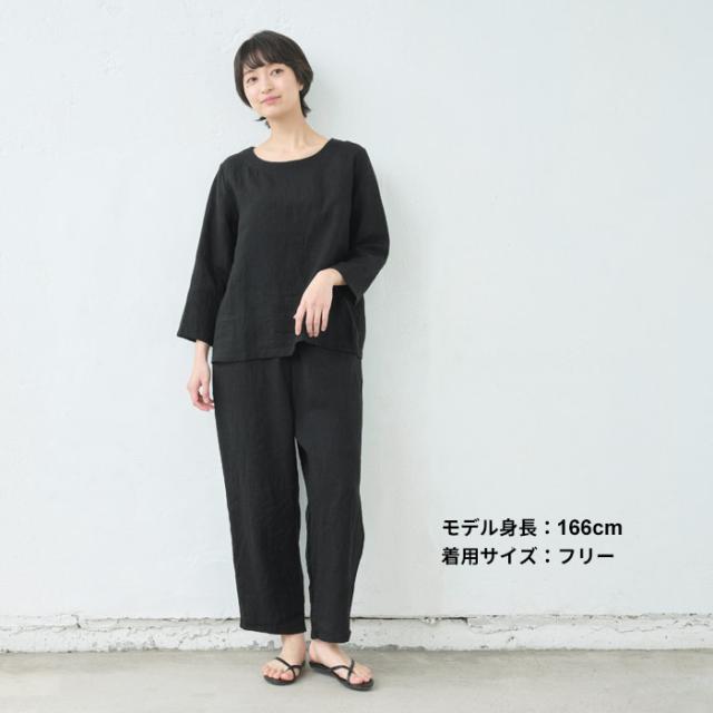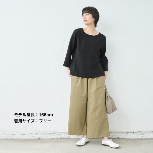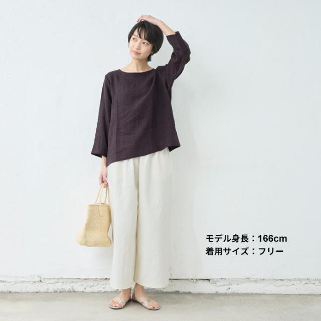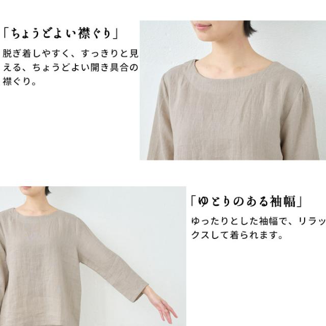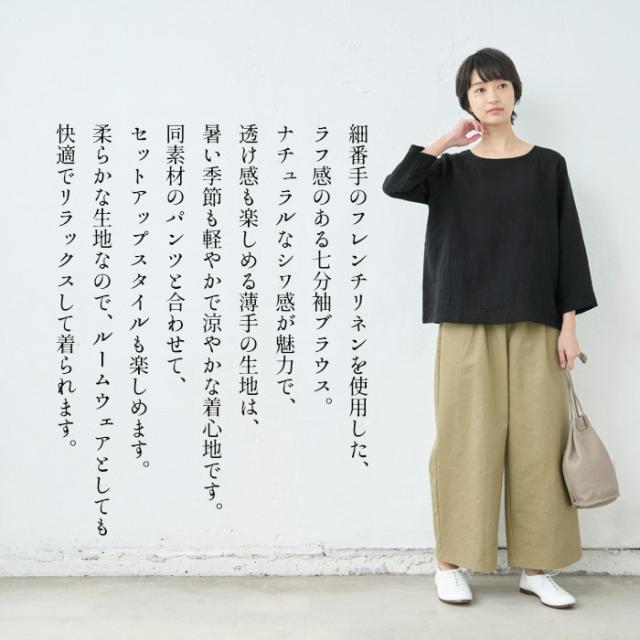 特徴 細番手のフレンチリネンを使用した、ラフ感のある七分袖ブラウス。ナチュラルなシワ感が魅力で、透け感も楽しめる薄手の生地は、暑い季節も軽やかで涼やかな着心地です。同素材のパンツと合わせて、セットアップスタイルも楽しめます。柔らかな生地なので、ルームウェアとしても快適でリラックスして着られます。