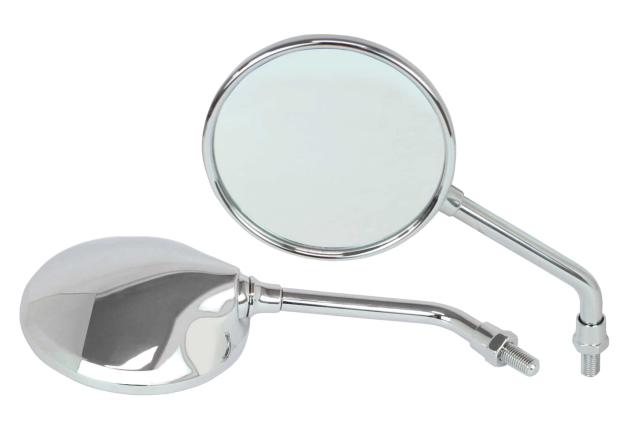 汎用性の高い丸みのあるクラシカルな形状を採用。 カラーはブラックとメッキの2種類からいただけます。それぞれ正ネジタイプと逆ネジタイプの商品を設定しております。 ミラーのボディー形状とミラーの面積は新保安基準を満たしています。取付けネジサイズは、M10ピッチ1.25になります。 ※スクーター等、カウルの奥まったところにミラー取付け部がある車両の場合、ミラーを直接取付け出来ない場合があります。