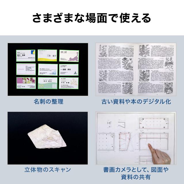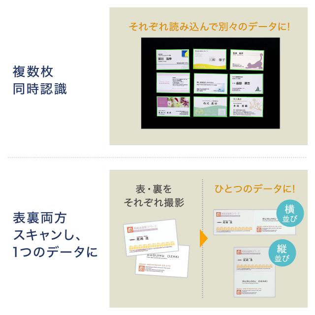 ●複数並べた名刺を一気に読み込む撮影機能付きです。(※OCR機能はなく、画像として保存されます。名刺管理ソフトは付属しません)