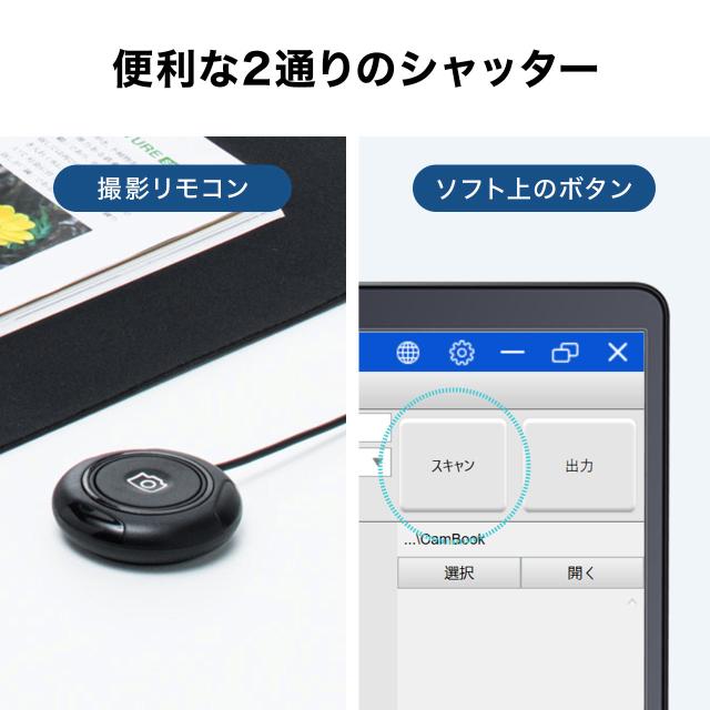 ●開いた冊子を指で押さえながら撮影する時に便利な手元リモコンが付属します。