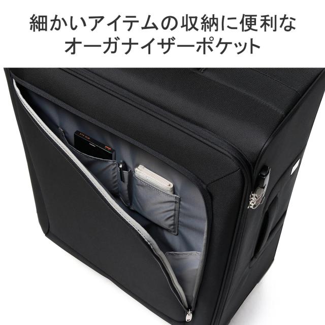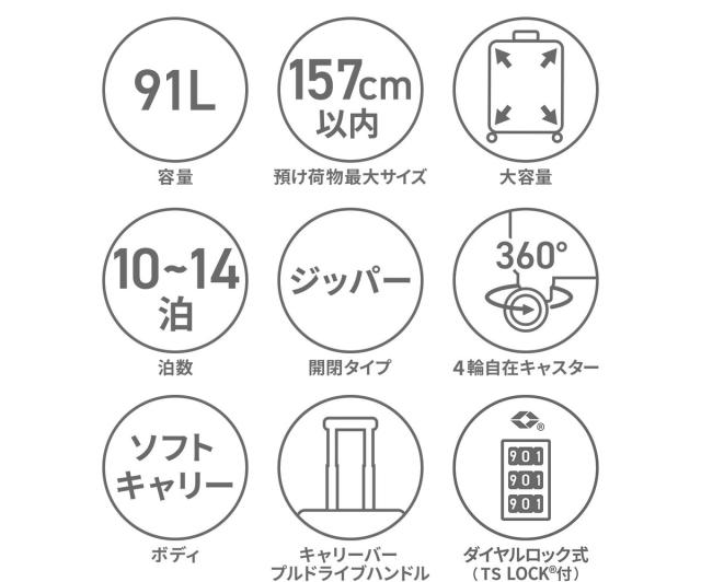 軽量かつ丈夫な素材を採用し、耐久性と軽量性を両立したソフトトローリー。こちらは10〜14泊程度の旅行に適した容量91Lサイズです。預け入れ手荷物国際基準サイズをクリアし、ホームステイや家族旅行にも役立ちます。開閉は横開きタイプで、たっぷりとした奥行きで高い収納力を備えているほか、小物類を整理収納する気の利いたポケットも装備。旋回性に優れたキャスターやTSロックなど、旅に必要な機能を搭載したベーシックなアイテムです。