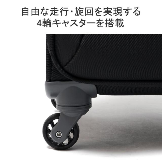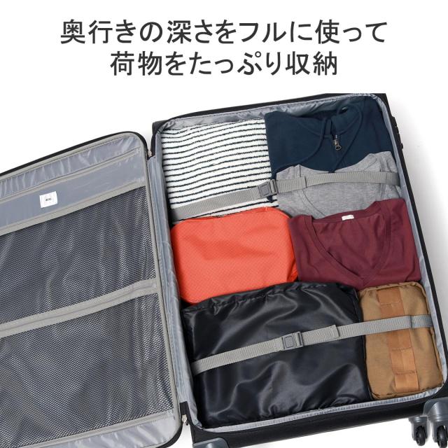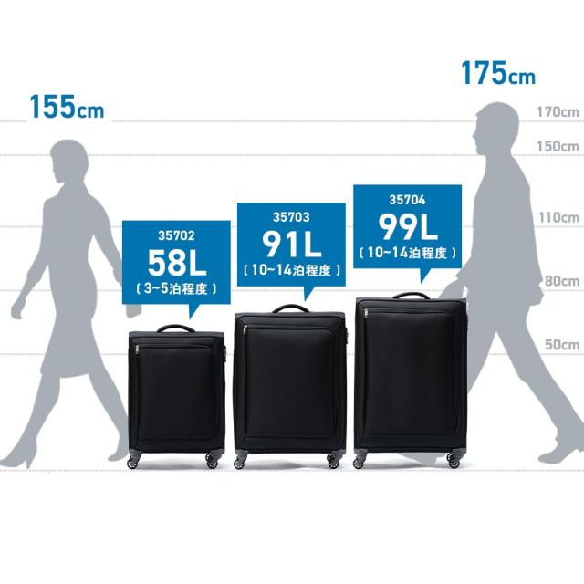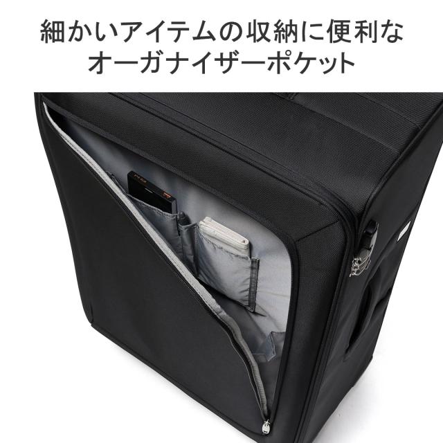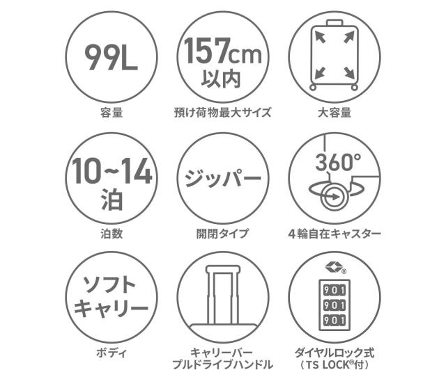 軽量かつ丈夫な素材を採用し、耐久性と軽量性を両立したソフトトローリー。こちらは10〜14泊程度の旅行に適した容量99Lサイズです。開閉は横開きタイプで、たっぷりとした奥行きで高い収納力を備えているほか、小物類を整理収納する気の利いたポケットも装備。旋回性に優れたキャスターやTSロックなど、旅に必要な機能を搭載したベーシックなアイテムです。