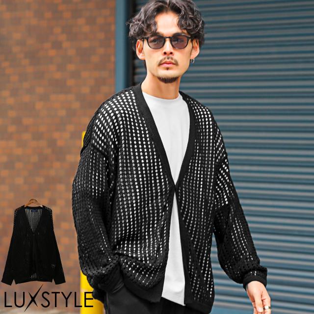 カーディガン メンズ メッシュ オーバーサイズ 無地 ブラック 透け感 春秋【7Gメッシュ編みオーバーサイズ1ボタンカーディガン】 aa-2999