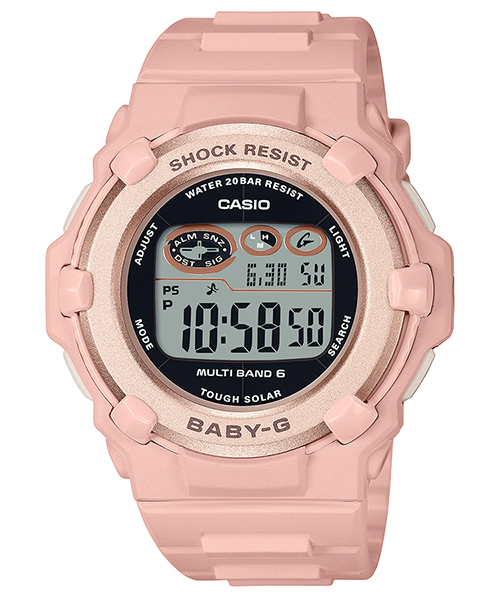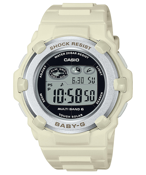 カラーはベーシックなホワイトとピンクをラインアップ。季節を問わず幅広いファッションに合わせやすいデザインです。機能面では、世界6局の標準電波に対応し、ホーム都市設定を変えるだけで日本国内はもとより、海外でも時刻を自動修正します。また、タフソーラーも搭載。更に20気圧防水機能にも対応し実用性も兼ね備えました。アクティブな女性をサポートするモデルです。