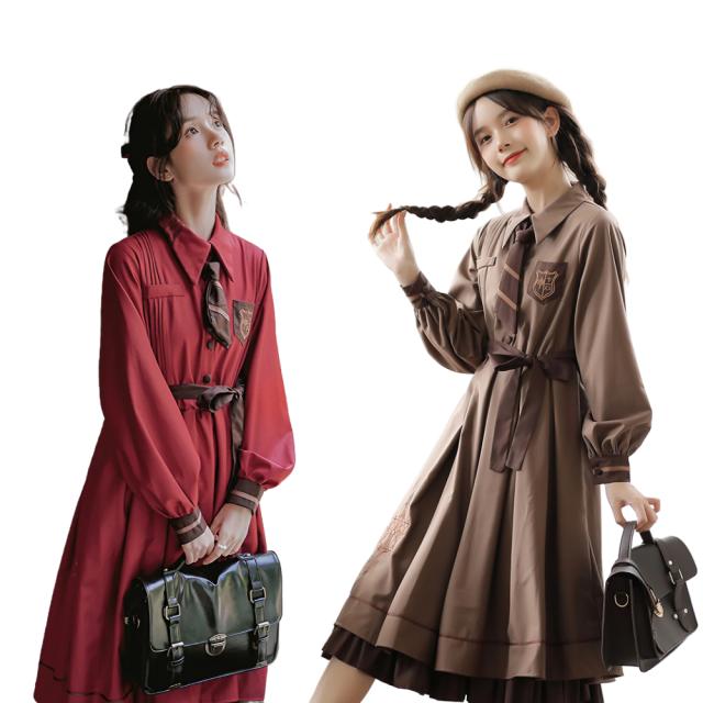 ワンピース 学生風 探偵風 森ガール ロングワンピース レトロ ワンピ マキシ丈 春 秋 長袖 レディース 大人 女子 ワンピ ネクタイ かわいい 可愛い カジュアル ロリータ ロリィタ 襟 学校 学院 学園 女子校生 演劇 舞台
