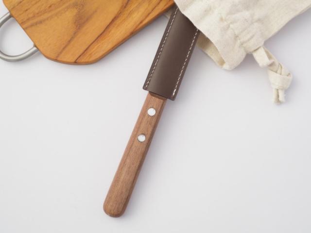 本革のシース(ケース)付きのブレッドナイフです。これがあれば、アウトドアやピクニックシーンでも本格的なパンを楽しめます。