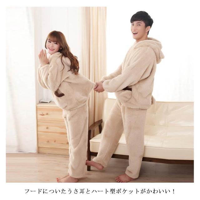 | 大人可愛いペアルックパジャマ上下セット(男女価格別々) 優しい素材でもこもこでフワフワな肌触り♪ 着ているだけで保温効果が抜群なので光熱費の節約にもなります。 丁寧かつ丈夫であるため、長期間やさしい着心地を楽しめます。 ポケット付き超便利で小物を入れできる! フードについたうさ耳とハート型ポケットがかわいい! | |