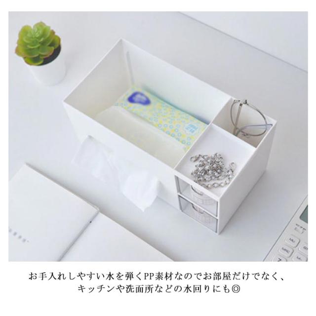 | デスク上の小物を収納できる引き出し付きティッシュボックス。 小物を収納できる引き出し付きで、アクセサリーを入れたり、メガネや文房具を入れたり、場所によっていろいろな小物を収納しておけます。 お手入れしやすい水を弾くPP素材なのでお部屋だけでなく、キッチンや洗面所などの水回りにも◎ シンプルモダンから北欧テイストのお部屋まで、どんなインテリアにもしっくり馴染むシンプルなデザイン。 大学生や社会人の新生活や単身赴任のワンルームなど1人暮らしにもピッタリなスタイリッシュなインテリア雑貨。 | |