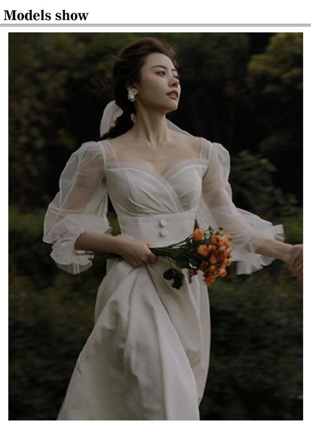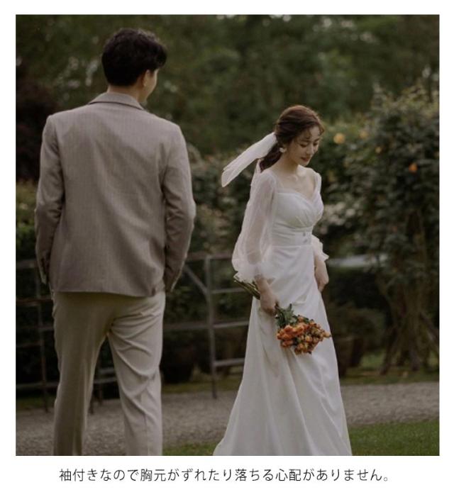 深いVネック ウェディングドレス ロングスリーブ シースルー シンプル ブライダル トレーンドレス 披露宴 ロングドレス 人気 大きいサイズ大人 上品 マキシ丈 海外旅行 写真撮影 ドレス 白 ワンピース ビーチフォト 前撮り 後撮り