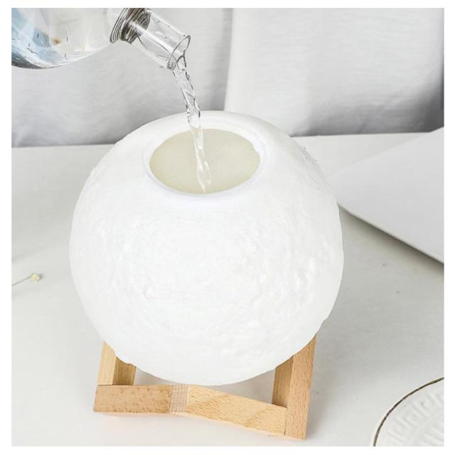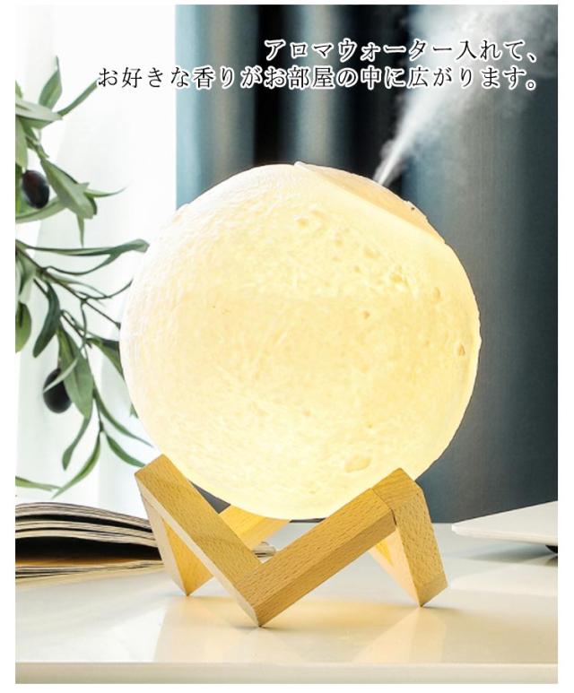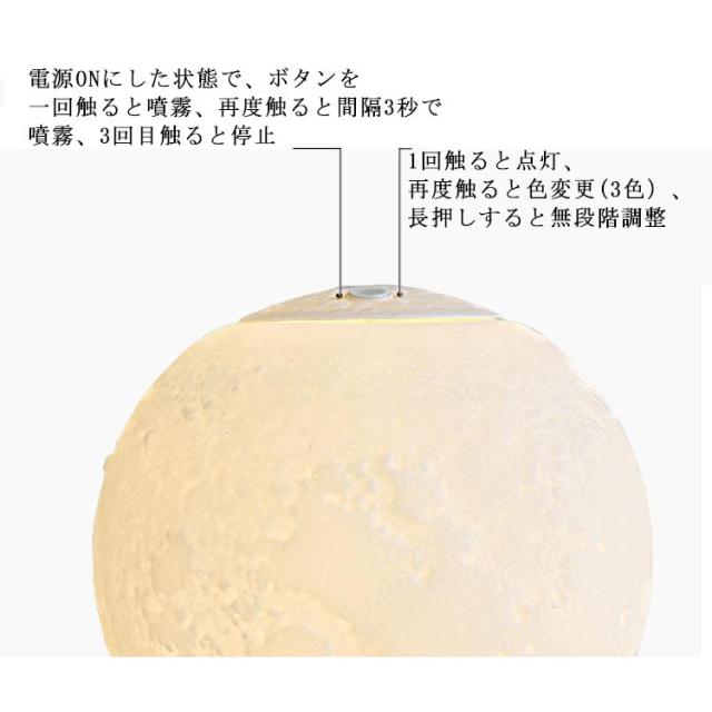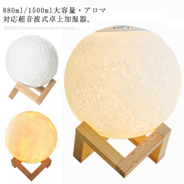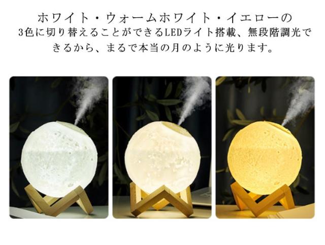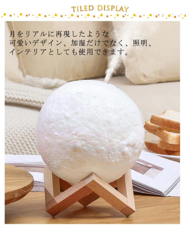 | 880ml/1500ml大容量・アロマ対応超音波式卓上加湿器。 月をリアルに再現したような可愛いデザイン、加湿だけでなく、照明、インテリアとしても使用できます。 アロマウォーター入れて、お好きな香りがお部屋の中に広がります。 連続ミストモードと間隔ミストモードの2種類のミストモード。 ホワイト・ウォームホワイト・イエローの3色に切り替えることができるLEDライト搭載、無段階調光できるから、まるで本当の月のように光ります。 | |