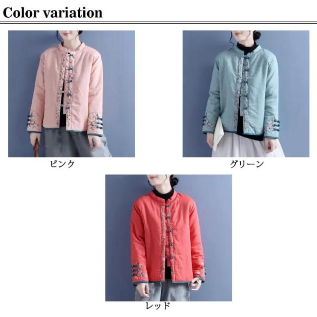 チャイナボタン 綿麻 ジャケット レディース 中綿入り カジュアルコート ショート丈 刺繍 アウター 立ち襟 中国風 トレロ 可愛い 森ガール 30代 40代 50代 春 秋 冬