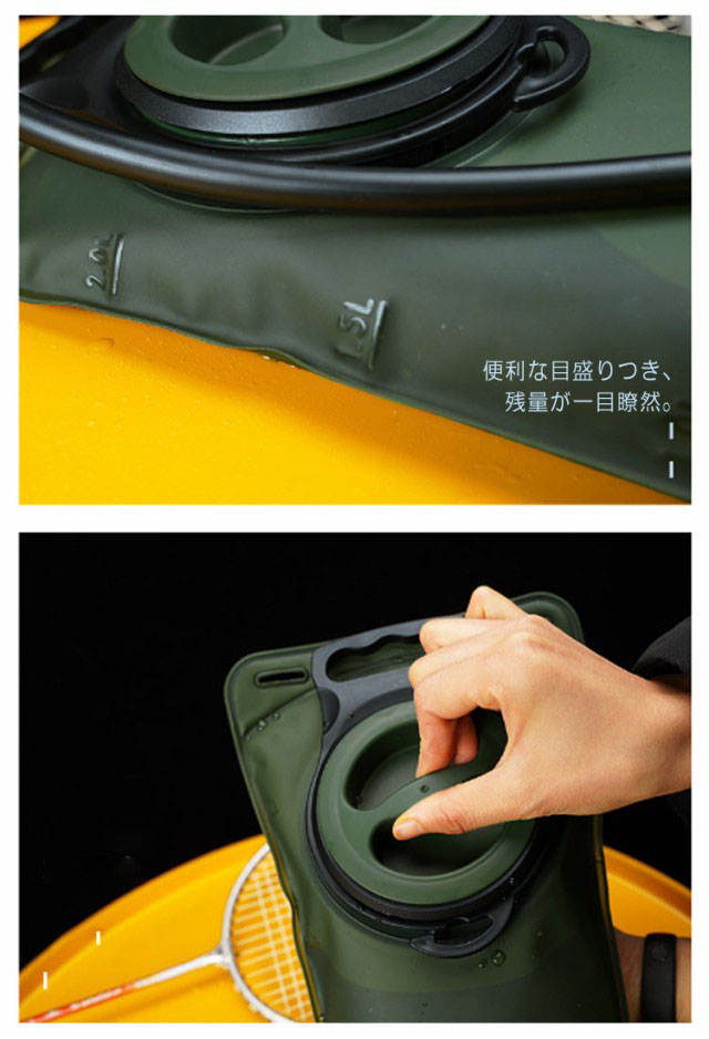 | アウトドアの水分補給に最適な水補給袋 サイクリング・山登り・ロッククライミング・ランニング・マラソンなど様々な用途にご使用頂ける水補給袋です。 チューブの長さは約100cmでリュックの内部に収納できます。登山やサイクリング時の水分補給は対応できます。 便利な目盛りつき、残量が一目瞭然。 食品グレードTPU素材を採用するので、ご安心してお使いいただけます。 使わない時はコンパクトで収納できて持ち運びラクラク。 アウトドアだけでなく、非常時、災害時の際に役立つ水袋となります。 | |