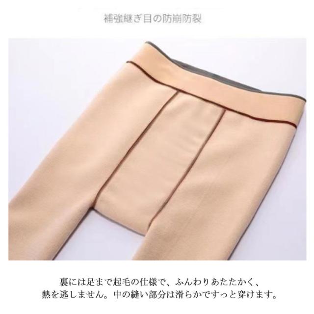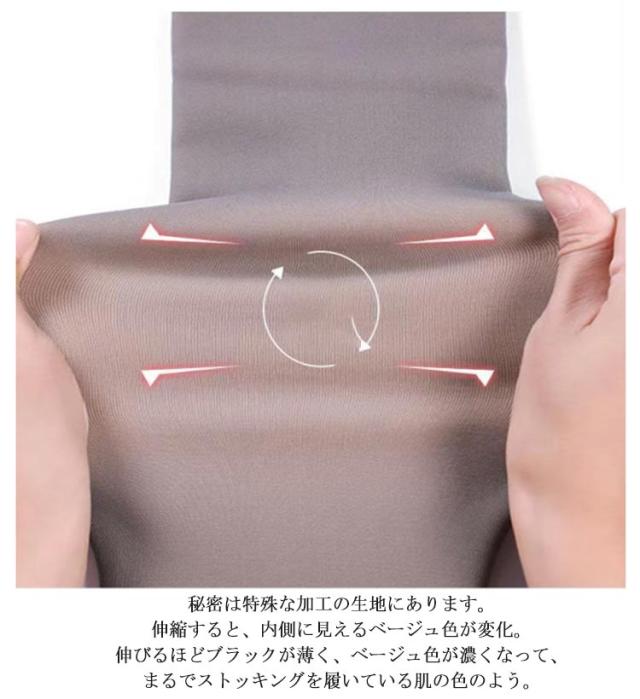 | スーパーストレンチの透け感のある裏起毛タイツ。 表には5種類の素材が混合された弾力性抜群の生地で構成されています。ウエスト、ヒップ、太もも、スネをしっかり包みます。美脚、美尻効果抜群です。 裏には足まで起毛の仕様で、ふんわりあたたかく、熱を逃しません。中の縫い部分は滑らかですっと穿けます。 秘密は特殊な加工の生地にあります。伸縮すると、内側に見えるベージュ色が変化。伸びるほどブラックが薄く、ベージュ色が濃くなって、まるでストッキングを履いている肌の色のよう。上品な透け感がオシャレさと美しいシルエットの脚ラインを演出します。 従来の二重生地の透け感タイツに比べて、こちらのタイツは二重生地ではなく、一体式デザイン、着ることも脱ぐこともしやすい、糸引っ掛けしない。優良な素材を使い、毛玉が起きにくく、足が細く見えるわりに締め付けない着用感を叶えてくれます。 就活、通勤、デート様々なシーンまで活用できる寒い季節のおしゃれに欠かせないアイテムです。体へのフィット感がバッチリ、スッキリとしたレッグラインを見せるレギンスは毎年のアイテム | |
