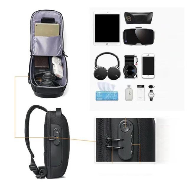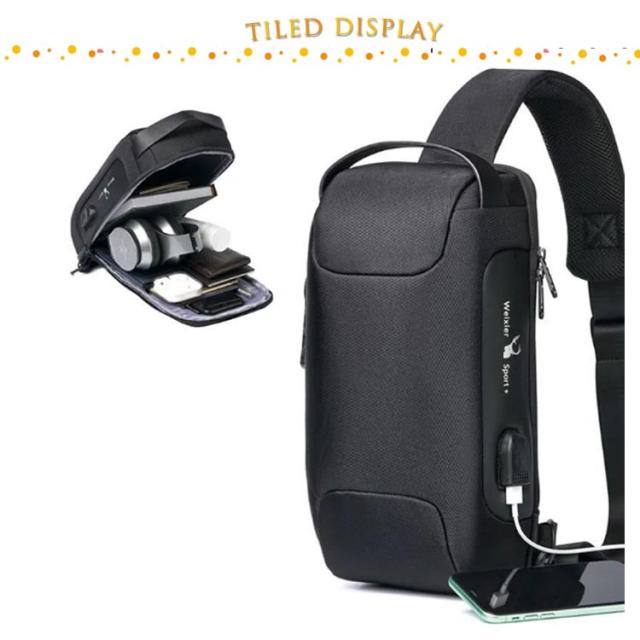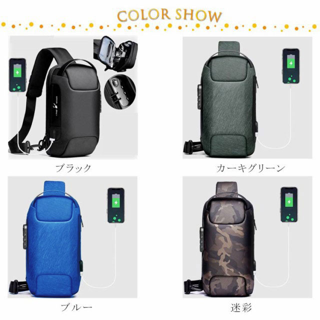 | 日常や旅行中の盗難防止ボディーバッグ! 立体整形されたシェル構造で荷物の多少にかかわらずかっこいいクールなシルエットをキープできます。 表面は丈夫なオックスフォード生地を使います、雨に強く、汚れに強く、お手入れも簡単です。 バッグの側面にUSBポートがあり、裏に付けたケーブルがモバイルバッテリの接続ができて、充電するとともに、気楽に片手でスマホが使えます。 | |