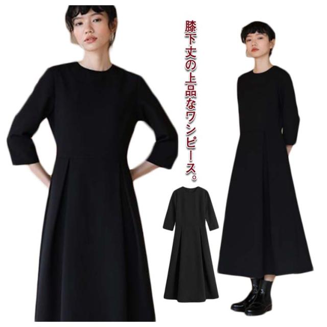 レディース ワンピース ロングワンピース 8分袖 大人 フォーマル 春 秋 ブラック 膝下 喪服 ポケット付き 上品 クルーネック 大きいサイズ 着?せ 結婚式 パーティ 発表会 エレガント 通勤 OL ママ
