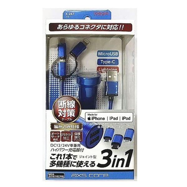 アークス X-257 車載用 MFi認証 3.1A アルミUSBチャージャー&3in1 マルチLightningケーブル(ブルー)[X257] 返品種別A